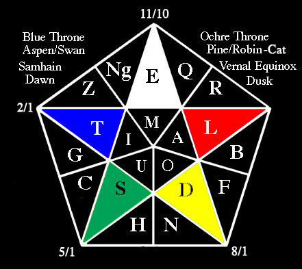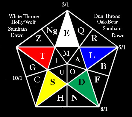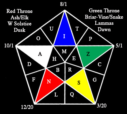 The five sided star formation is because the peoples of Anieth counted five seasons roughly analogous to Winter: 1/10-3/20, Spring: 3/20-6/1, Summer: 6/1-8/20, Harvest: 8/20-11/1, Hallows: 11/1-1/10, or seasons of 72 days each with five holidays. For more information, see the "Calendars" page. The 56 post circle is to mark the metonic cycle of two 19 year cycles and one 18, when the moon and sun are in phase. For instance, the sun and moon might be eclipsed in 5 degrees Gemini in 1900 and are likely to be again in 1956 and close to it in jumps of years of 3, 11, 8, 19 and 18.