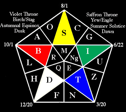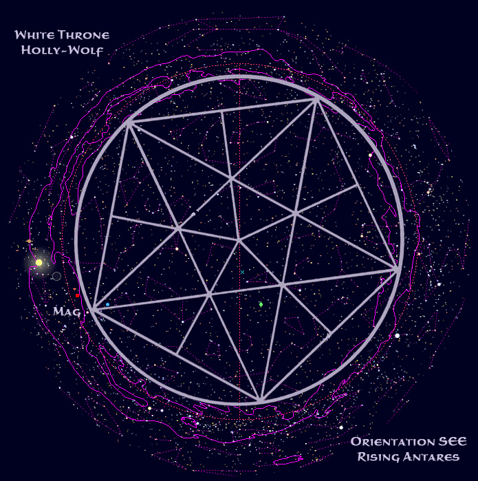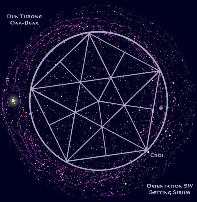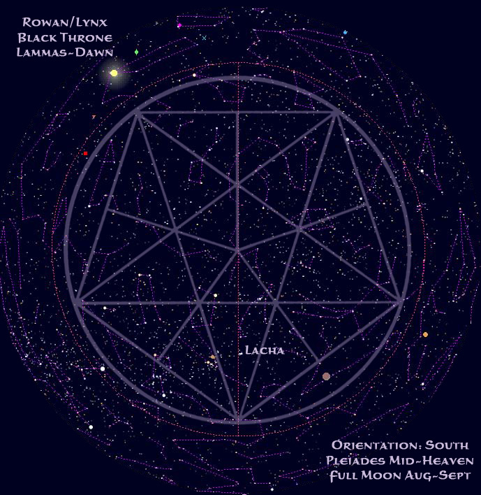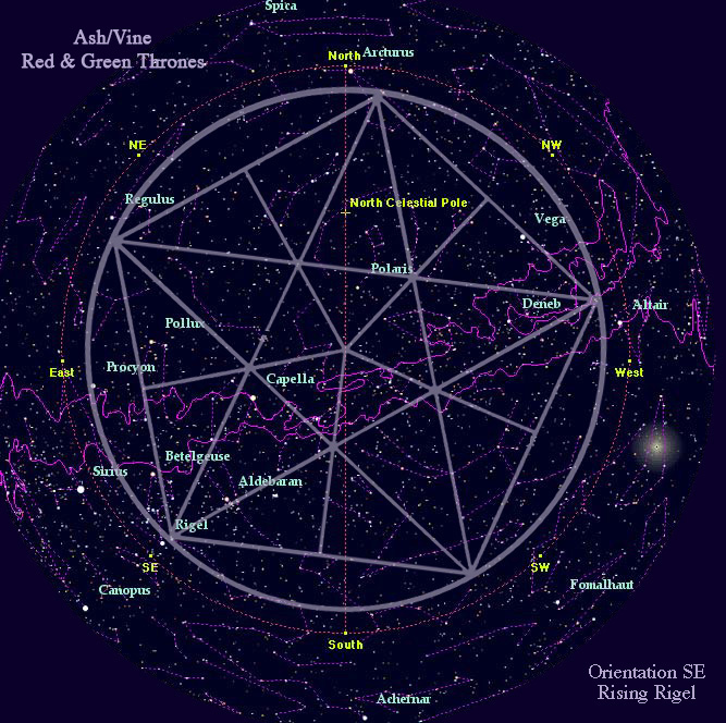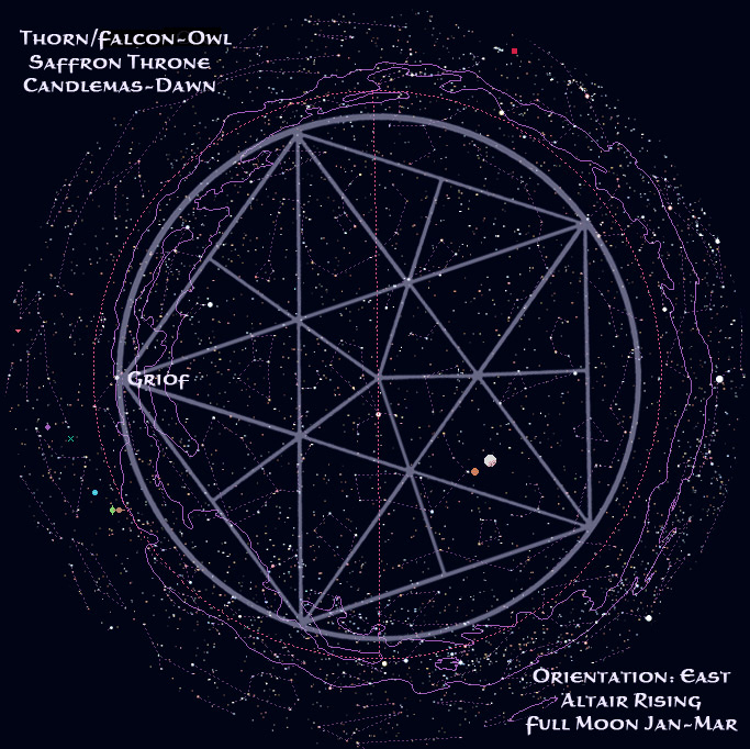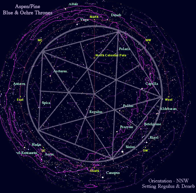 This observatory is oriented to the rising of Sirius, the setting of the Pleiades, the setting of Hadar, or the rising of Regulus or setting of Deneb. All over Anieth, there are observatories, usually on islands set in the middle of small lakes. None except An Doras have a maze and the gate. Each of the Nine Nations has an observator oriented to their star as shown below. (See Timelines for more information.) Many of the clans also have private observatories, but all of them are round henges (not oblong) along the five-sided star formation on the ground and the 56 post formation in the circle.