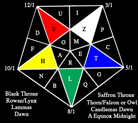 The observatory was paved with green slate. Inlayed into the slate, white quartz lines inscribed a l arge pentagram, which enclosed a five-fold star, the center of which was another a smaller pentagram, cut into five triangles. The sections of the pentagrams and star made a twenty-fold coordinate system mapping out the sky.