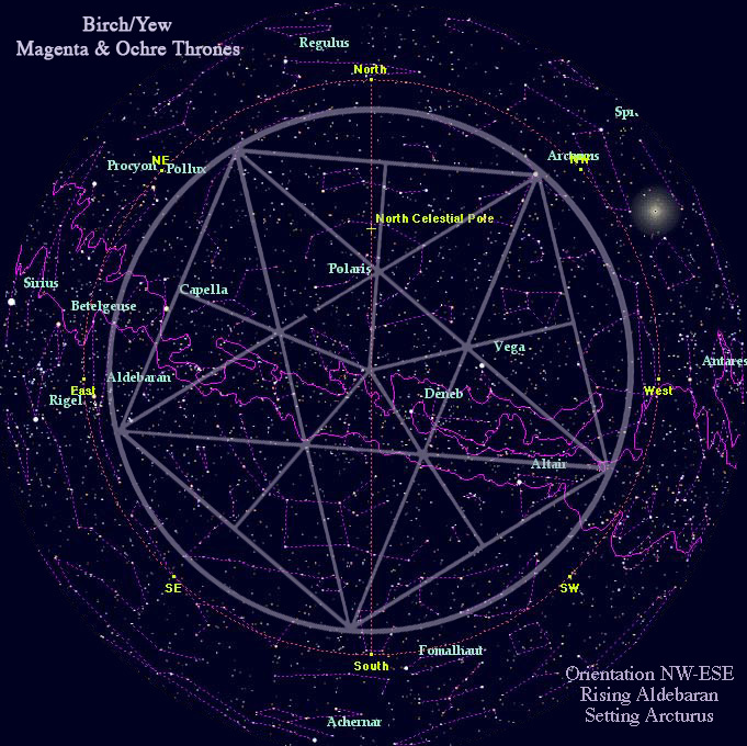This image shows a projection of the approximate rise and setting times of the major stars around 3000-2800 BC. This was the time of the building of many observatories on Earth, and other monuments such as the Pyramids at Giza. Most of the work in the British Islands and in Northwestern Europe was in the form of woodhenges. It was interesting for me to observe that all the stellar observatories of Anieth were woodhenges with stonework floors.