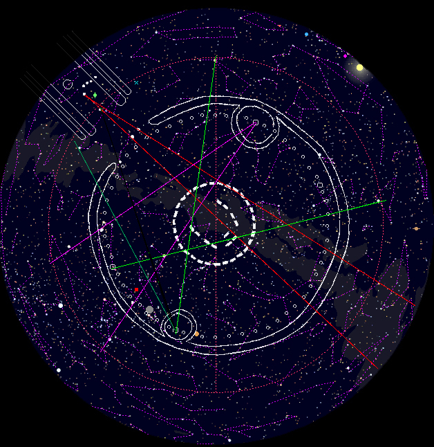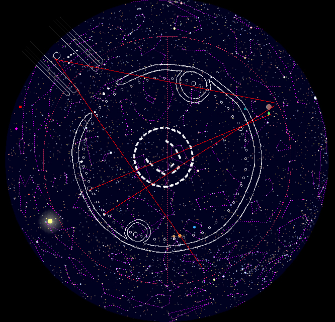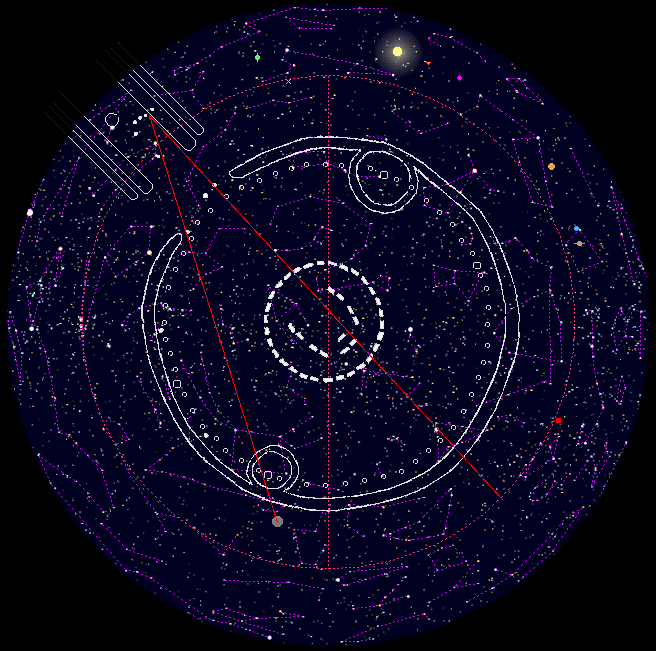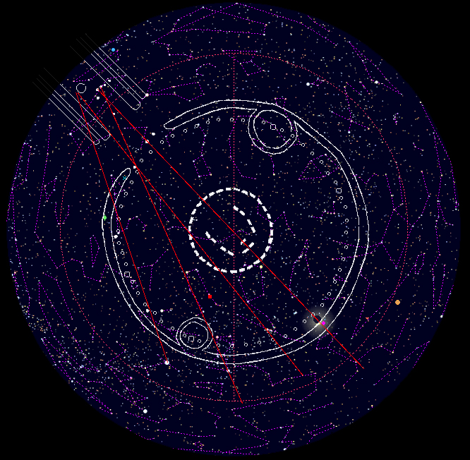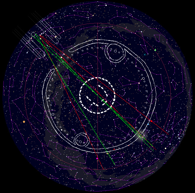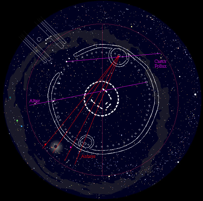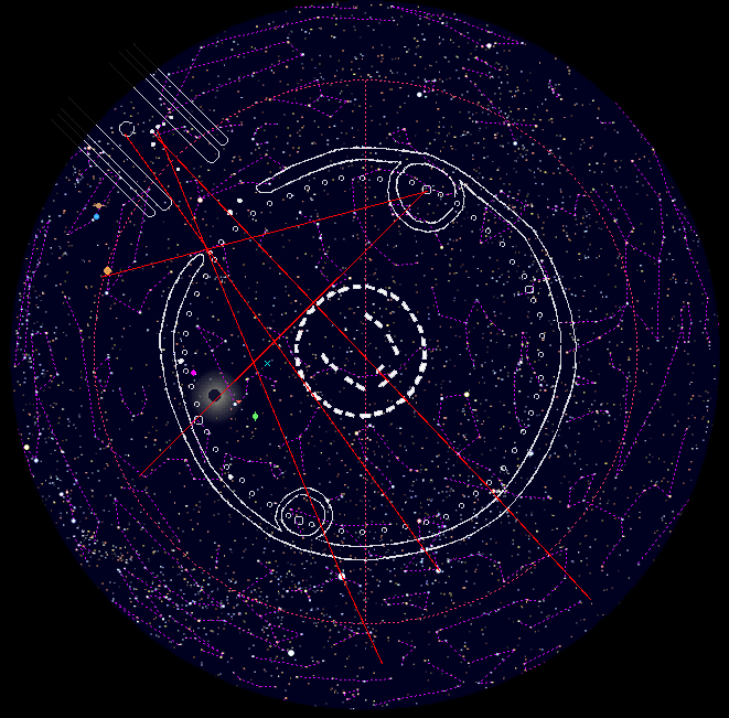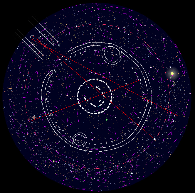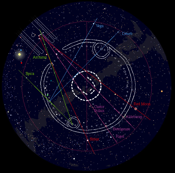 Here, Mars, Jupiter and Saturn have just set. Altair is visible high over the slaughter stone and the moon is ecliped in Aquarius/Pisces.