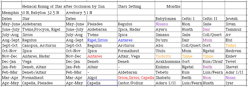 This table shows the heliacal rising after solar occlusion of the major stars. As you move to the north, some stars never set. At 51 degrees north, Canopus, Hadar and Formalhaut are invisible and Arcturus, Vega and Deneb never set. This would throw a little challenge into the building of the henges if they were merely copying work done at Sumer and Memphis. Yet, as you can see, there is a lose correspondence between months and rising times of stars.