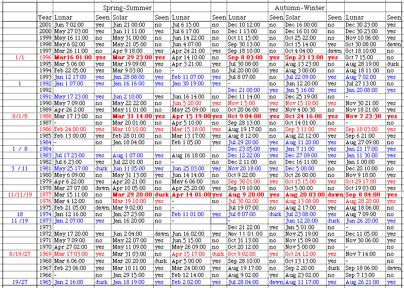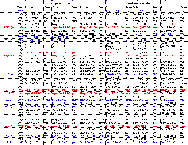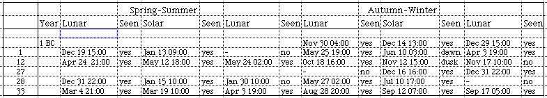 As you can see, the dates between lunar eclipses are usually 29. The precession between age years is variable, but begins with 355 days. Then a month is added, but due to the visibility problem, sometimes the years are not right on or the months right on. Looking back at our calendar, the year is about 355 days for 3 years and then a month is added to put the calendar close to the solar. Thus a year begin on Oct 25, then Oct 15, then Oct 5 then Sept 25 or add one month to get back to Oct 24.