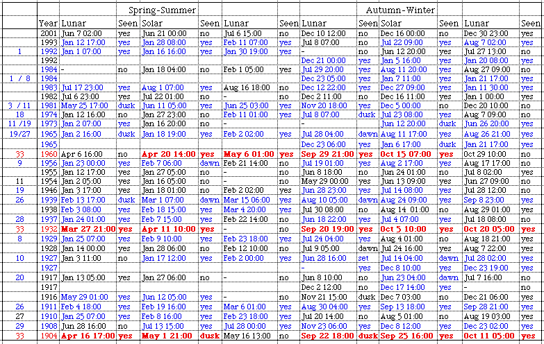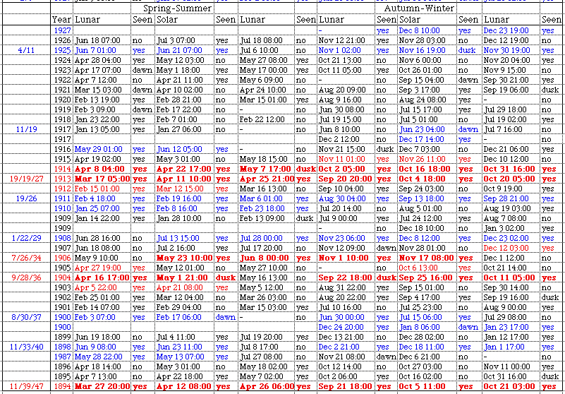 In the next charts I have used Stargazer to chart the lunar and solar eclipses for over 100 years. I have used red highlights for the autumnal/vernal eclipses and blue for the solstice eclipses. This makes for two distinct patterns of "ages". Because of the variability of the weather in the British Isles, we must consider the best viewing time. Although summer might be good weather, the sun would prevent any more than two hours of good viewing. Spring is much too volitile with the chances of clouds making viewing impossible rather too good. Winter as well. Like the Pacific Coast at the same latitude, the ocean delays the weather, so that often weather in October is much better in Vancouver and the British Isles than in June. This (silly) or practical consideration makes me think that the red highlighted dates would have been more important than the solstice eclipses.